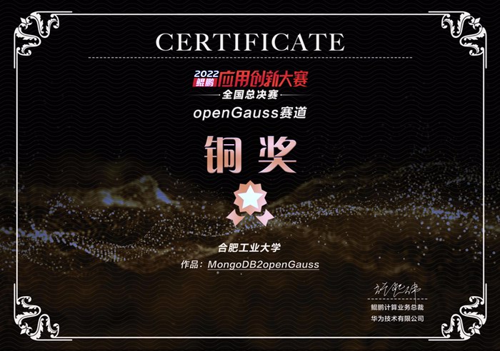 近日,2022鲲鹏应用创新大赛全国总决赛在浙江杭州落幕。新葡萄官网本科生团队“HFUT队”(指导教师:胡敏)斩获openGauss赛道全国总决赛铜奖。