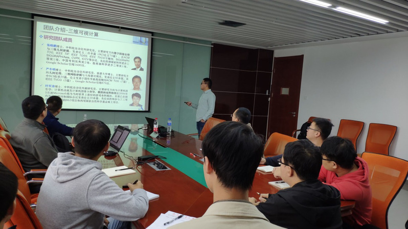 此次学术交流活动中,郭博士主要介绍了所在的研究团队近年来发表在ToG、CAD、CVPR、ICCV等领域顶级期刊或会议上的多个论文项目,从模型部件框架轮廓提取、基于最优蓝噪声顶点分布的模型优化方法、基于多视图的场景建模等三个方面介绍了组内的工作,并对未来研究方向给出了展望。报告结束后,在场师生针对报告内容和郭博士进行了深入的交流讨论。