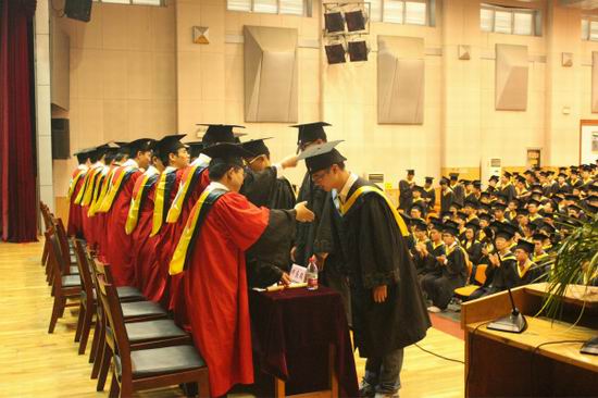 仪式在庄严的国歌声中拉开序幕,学院党委副书记、副院长何庆领宣读了《新葡萄8883官网AMG官网2015届毕业生学士学位授予决定》,全院共计530名同学被授予了工学学士学位。随后,校领导与学院学位评定委员会全体委员一起为全体学士学位获得者颁发学位证书,扶正流苏并合影留念。