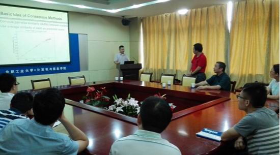应新葡萄8883官网AMG官网国家"111计划"老人福祉信息科技创新引智基地杨矫云老师邀请,2015年6月23日下午15:00,美国密苏里大学尚奕教授在逸夫楼408会议室做了题为“Machine learning methods for protein structure prediction and ambulatory assessment of alcohol craving”的报告。报告由计算机学院院长助理王伟副教授主持,学院相关教师、研究生聆听了报告。