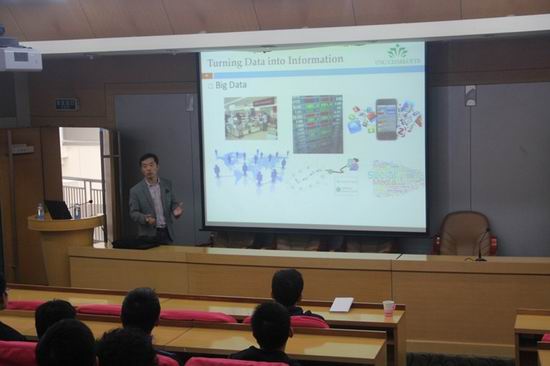 本次报告中葛永教授介绍了他最近在“基于手机平台的网络内容推荐”这个方向上的一些研究成果。他首先介绍了数据挖掘的一些基础方向,之后着重介绍了一个高效的手机推荐系统,该系统能够根据采集到的出租车数据为司机推荐一个可靠的载客线路。最后葛永教授介绍了他对该方向的一些前瞻性见解以及一些正在进行的工作。葛永教授的报告引起了在场师生的热烈讨论,在问答环节中他针对在座师生的一些疑问,进行了深入分析和回答。