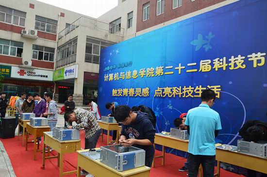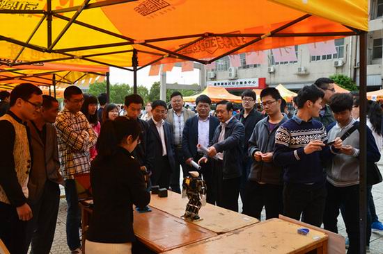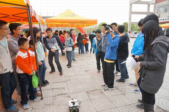 此次科技节开幕式展区呈现“IT”的字母形状,与新葡萄官网特色专业计算机息息相关,共设置四大版块,分别是以动手实践能力为主的装机大赛区,以科技前沿展示为主体的实验室作品区,以各高校优秀学生作品为主体的C9高校联盟展品区,以未来科技为主体的体验区。合肥C9高校联盟成员中国科技大学、安徽大学等6所高校,新葡萄8883官网AMG官网分布式控制实验室、计算机应用技术实验室等6个实验室的30余项学生自制高科技展品纷纷亮相科技节开幕式,有飞思卡尔智能小车,机器人舞蹈展,意念控制小车,智能追溯系统,航模等展品,有移动4G,火狐电脑小插件,体感游戏机等现场体验品,还有装机大赛,混乱代码大赛等项目比拼。