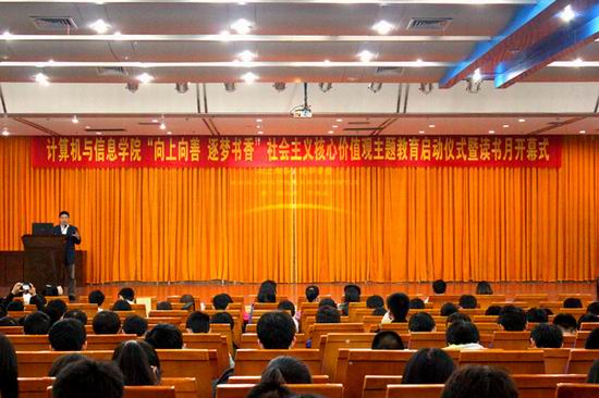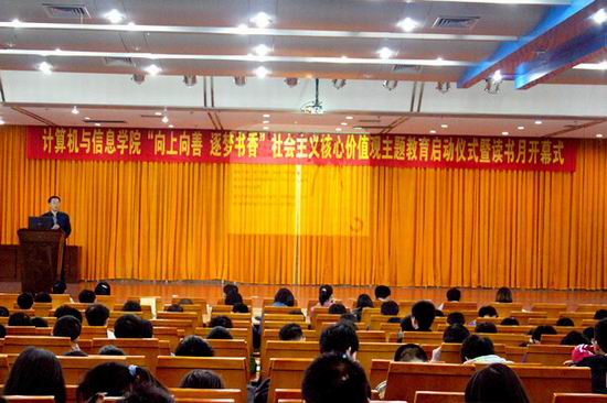 提升人文素养,加强内涵建设是践行社会主义核心价值观的重要体现,学院以读书月系列活动为主体践行社会主义核心价值观。在启动仪式上,学院党委副书记、副院长何庆领宣读学院《关于开展践行和培育社会主义核心价值观主题教育活动的通知》,从夯实学风建设、宣传典型事迹、传承志愿精神、加强文化熏陶、完善道德建设五个方面深入全面部署了学院的社会主义核心价值观主题教育活动方案。随后,主持人详细介绍了“E路相伴,逐梦书香”读书月系列活动的具体内容,并邀请学生代表宣读《读书倡议书》,倡导学生用读书来校正人生航向,推助成长进步,提升道德素质,将读书活动与学风建设相结合,将学风建设与践行社会主义核心价值观相结合。