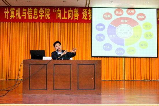 开幕式结束后,马克思主义学院檀江林教授应邀为学院广大师生作了题为《我们的价值观,我们的中国梦》的报告,结合新葡萄官网的发展历程,通过对社会主义核心价值观内容的深刻解读,勉励大家坚定信念,夯实基础,矢志奋斗,并就培育和践行社会主义核心价值观的方式和渠道与在场同学进行了深入交流。