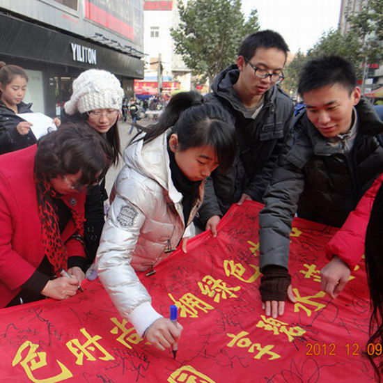 为了增强广大同学的环保与社会责任意识,提高个人文明与道德修养。2012年12月9日,新葡萄8883官网AMG官网通信工程12-1班在合肥市步行街开展了“静以修身,俭以养德”之德育团日环保宣传活动。