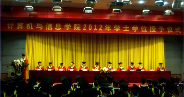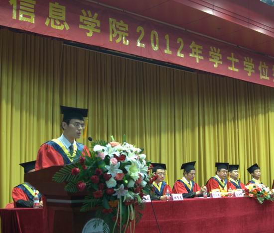 导师代表夏娜教授、毕业生代表孙艺云同学先后发言,分别表达了导师对学生的殷切期望和祝福,以及毕业生对母校和老师的深深眷恋之情。 副校长、学院院长刘晓平教授致辞,充分肯定了2012届毕业生所取得的优秀成绩,同时殷切希望同学们在今后的学业和工作中能够继续保持自己本科时代“钢铁般的意志”“冰山般的冷静”“大海般的胸怀”“初恋般的激情”。随后,刘院长以自己教授的《计算机操作系统》课程里的经典术语表达了对毕业生们的祝福与期待,“祝愿大家在今后的人生旅途上,搞好’物理实现’、’逻辑扩充’之关系,发挥’并发执行’之优势,提出更好的’FIFO’、’LRU’算法,推动事业、家庭’多进程’管理,让自己人生之大’操作系统’永远告别’死锁’,即使在某个局部时间内出了点问题,也不要盲目’摒弃’,合理运用’最小代价算法’解除’死锁’,确保物理人生永不’虚拟’!”