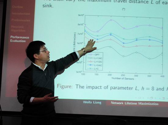 应新葡萄8883官网AMG官网邀请,澳大利亚澳洲国立大学(Australian National University)计算机科学系梁维发教授于2011年12月13日来新葡萄官网进行为期一天的学术活动。下午15:30,梁维发教授在校学术活动中心二楼小报告厅为新葡萄官网与安全关键工业测控技术教育部工程研究中心的师生作了题为“Network Lifetime Maximization in Sensor Networks with Multiple Mobile Sinks”的学术报告。报告由刘晓平院长主持,学院和工程中心的相关教师、研究生和本科生参加并聆听了报告。