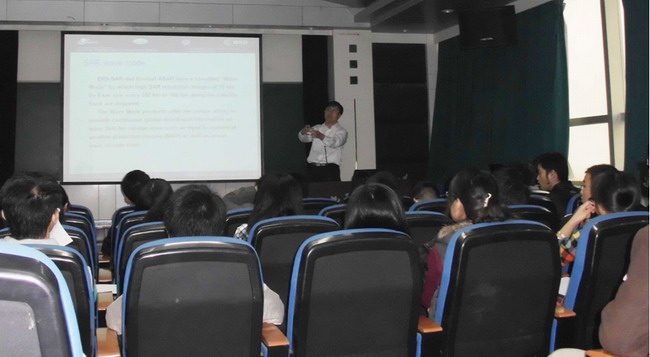 孟俊敏研究员在报告中首先介绍了合成孔径雷达(Synthetic Aperture Radar,简称SAR)遥感技术在海洋动力环境监测中的应用研究,包括如何利用SAR提取海面风场、海浪、浅海水下地形、海洋内波等参数;然后介绍了SAR在海上目标监测中的应用研究,主要包括利用SAR提取海面溢油、海冰和舰船等海上目标的方法;最后介绍了二维经验模(EMD)方法在海洋信息分离中的应用。孟俊敏研究员的报告全面概括了SAR遥感技术在中国海洋监测上的研究与应用现状,并展示了大量的应用实例,引起了在座师生的浓厚兴趣,大家分别就自己感兴趣的问题进行了热烈地交流互动。
