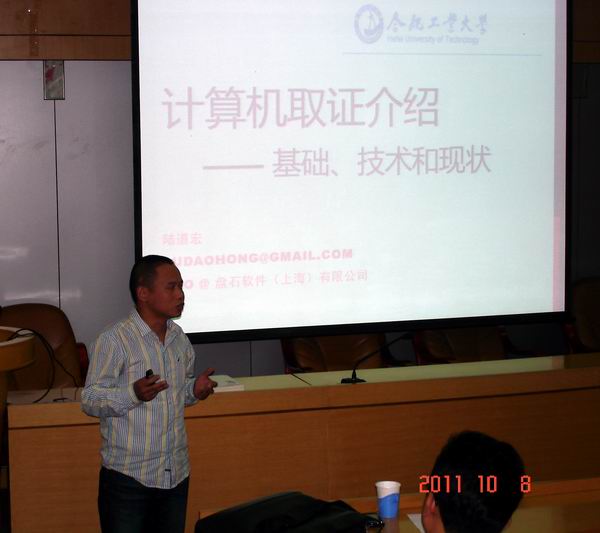 应新葡萄8883官网AMG官网邀请,2011年10月8日下午16:30 - 17:30,盘石软件(上海)有限公司陆道宏技术总监在校学术会议中心二楼小报告厅做了题为“计算机取证介绍——工具、技术和发展”的报告。报告由新葡萄8883官网AMG官网杨学志副院长主持,院长刘晓平教授、安徽省信息安全相关部门领导、新葡萄8883官网AMG官网相关教师、研究生和本科生聆听了报告。