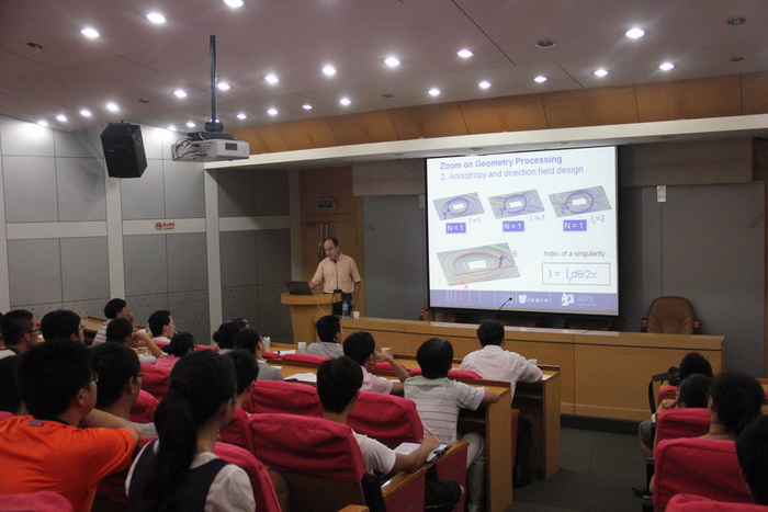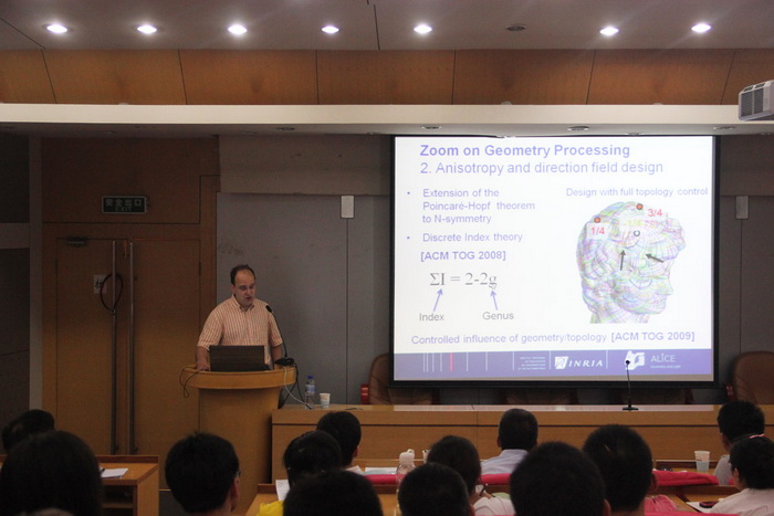Bruno Lévy教授,INRIA Nancy Grand-Est和LORIAlab的高级研究员。他同时还是ALICE项目团队的带头人。主要研究方向是数字几何,即基于应用数学,计算机数据结构和几何体计算,找到最优化的3D模型。他通过3D建模软件实现了UV纹理自动映射算法,以及基于泰森多边形分析的网格划分算法。Bruno Lévy教授是ACM SPM 2007,ACM SPM 2008以及ACM/EG SGP 2010的合作主席。他同时也是Graphical Models 、和IEEE Transactions on Visualization and Computer Graphics的副主编。Bruno Lévy教授在SIGGRAPH、ACM Transactions on Graphics、IEEE Transactions on Visualization and Computer Graphics发过多篇论文。会后,Bruno Lévy教授参观了VCC实验室,进行了学术交流。