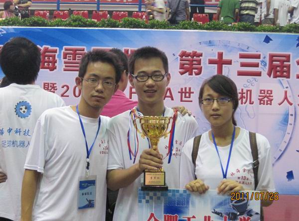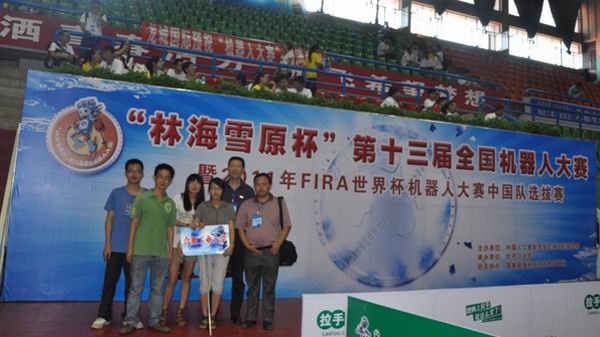 “林海雪原杯”第十三届全国机器人锦标赛暨2011年FIRA世界杯机器人大赛中国队选拔赛于7月24日-26日再在黑龙江省牡丹江市举行,来自北京大学、哈尔滨工业大学、华中科技大学、北京理工大学、四川大学等52所高校的500多名师生参加了该项赛事。新葡萄官网HfutEngine代表队在王浩教授、方宝富老师带领下参加比赛,8名“引擎”仿人机器人在4名参赛队员精心调试下,经过顽强拼搏分别获得类人型阶梯跑比赛季军,获得类人型单人、双人舞蹈、类人型点球二等奖,获得类人型短跑、类人型1VS1击剑、类人型1vs1拳击、广播体操三等奖。中央电视台对新葡萄官网队员羊志琼同学进行了采访。