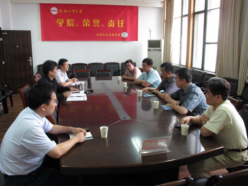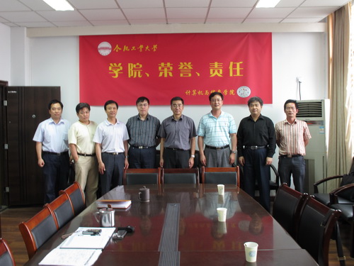 2011年6月24日下午14:30-17:00,刘晓平院长、蒋建国书记、王伟院助在科技楼学院会议室会见了北京航空航天大学信息学院副院长刘建伟教授、石家庄铁道大学信息学院院长赵正旭教授一行,刘晓平教授首先介绍了学院的发展历史和教学、科研现状,对两位院长到访表示欢迎。学校人才办孙祥主任、学院院长助理王伟博士、计算机系副主任胡东辉博士会见时在座。双方就管理、考核机制的建立和实施广泛地交换了意见,之后,客人在参观了工程中心、图像处理研究室、VCC 研究室等,图片报道。